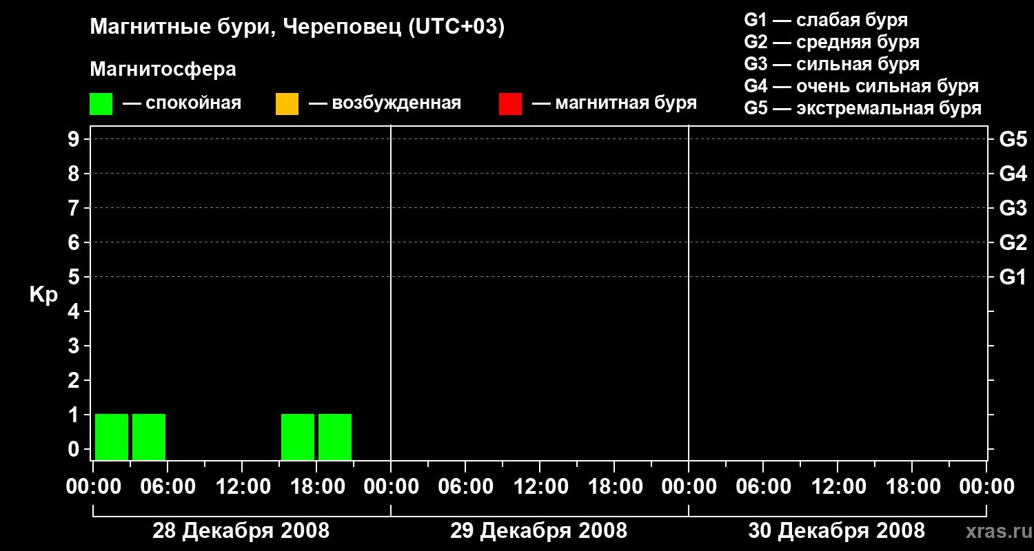 Изменения геомагнитного индекса Kp с 28 по 30 декабря 2008 года для средних широт
