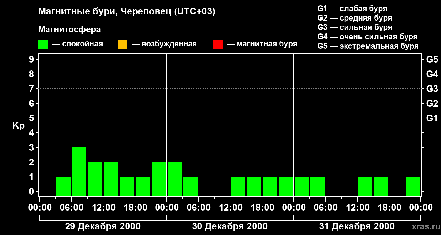 Изменения геомагнитного индекса Kp с 29 по 31 декабря 2000 года для средних широт