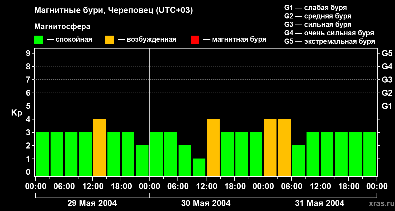 Изменения геомагнитного индекса Kp с 29 по 31 мая 2004 года для средних широт