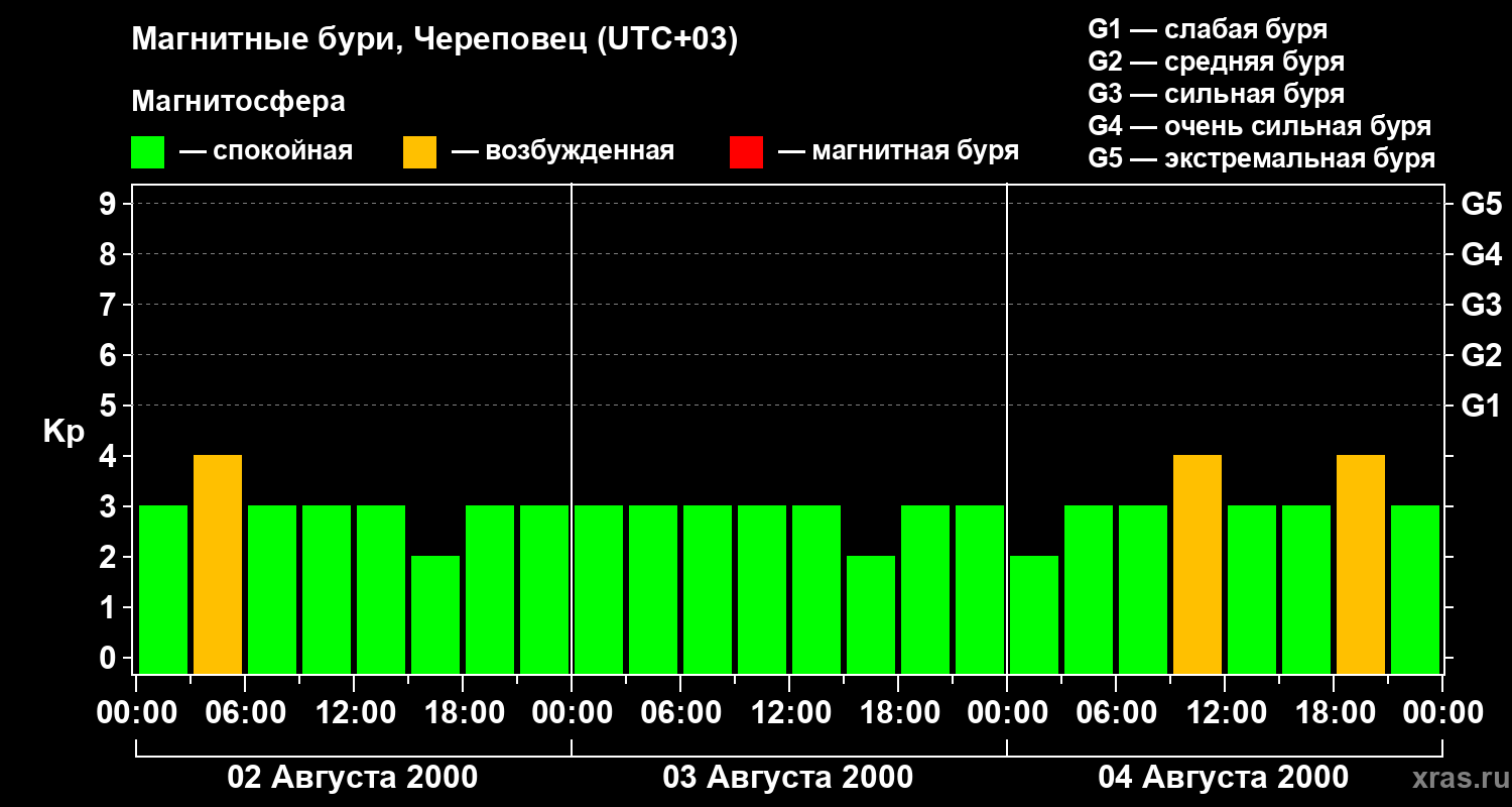 Изменения геомагнитного индекса Kp с 2 по 4 августа 2000 года для средних широт