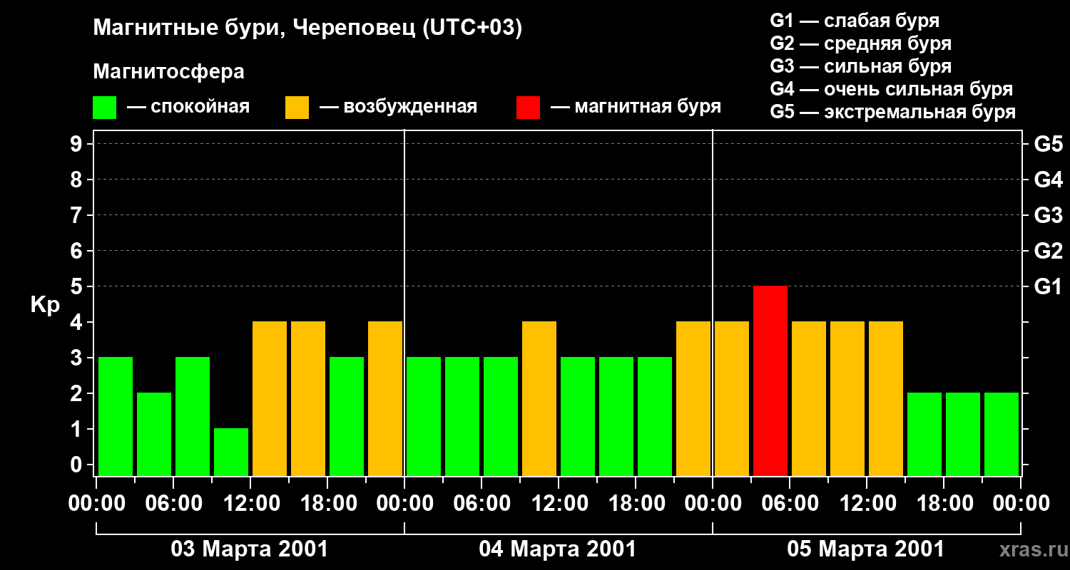 Изменения геомагнитного индекса Kp с 3 по 5 марта 2001 года для средних широт