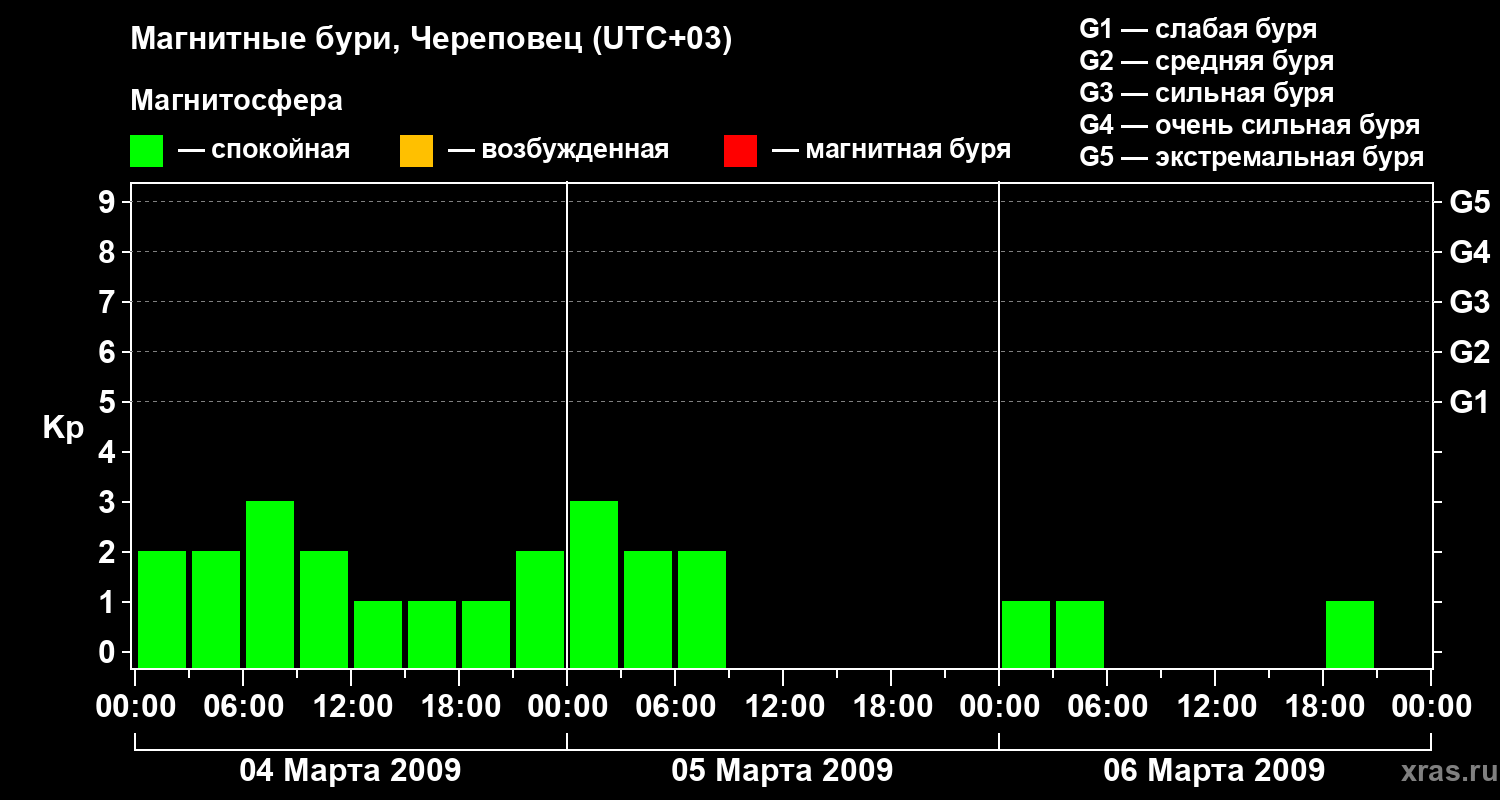 Изменения геомагнитного индекса Kp с 4 по 6 марта 2009 года для средних широт