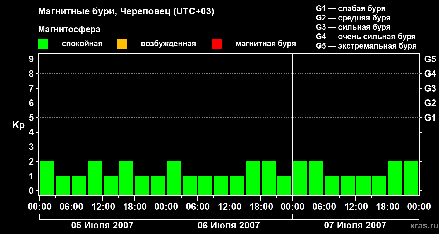 Изменения геомагнитного индекса Kp с 5 по 7 июля 2007 года для средних широт