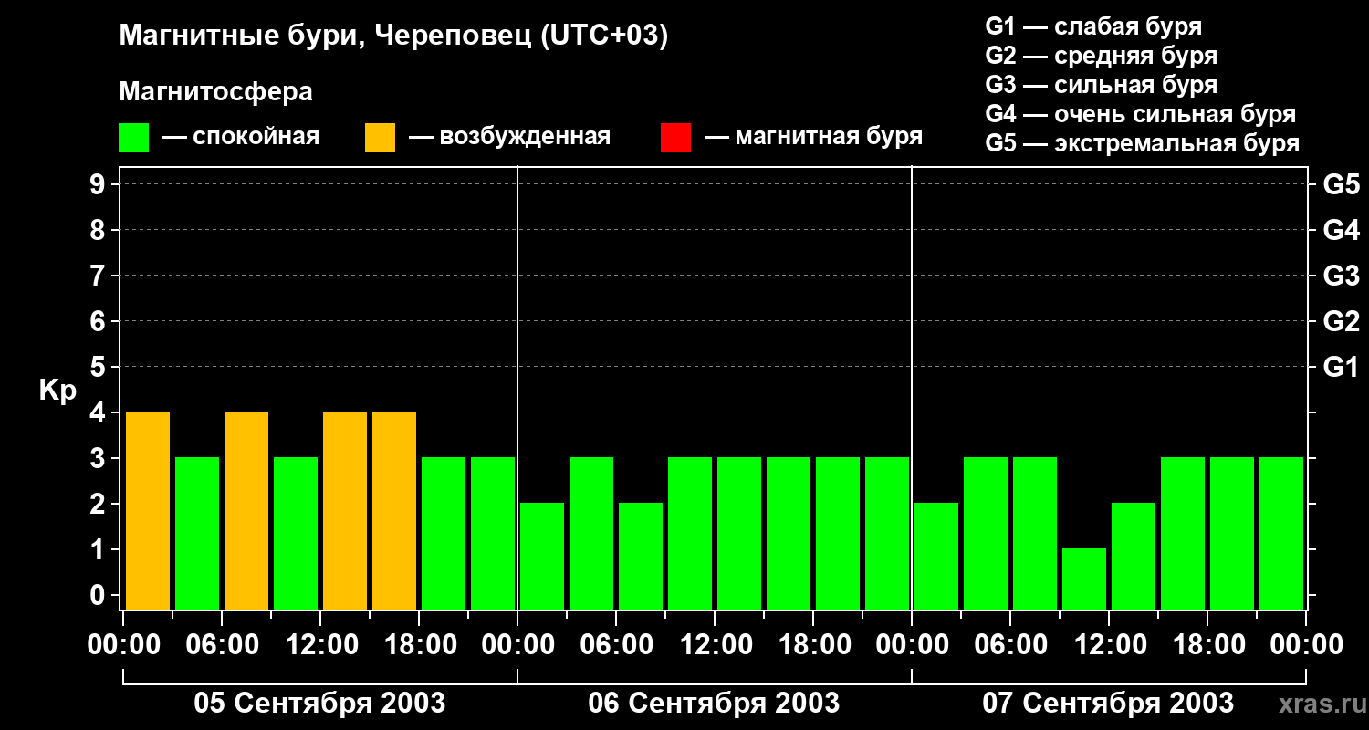 Изменения геомагнитного индекса Kp с 5 по 7 сентября 2003 года для средних широт