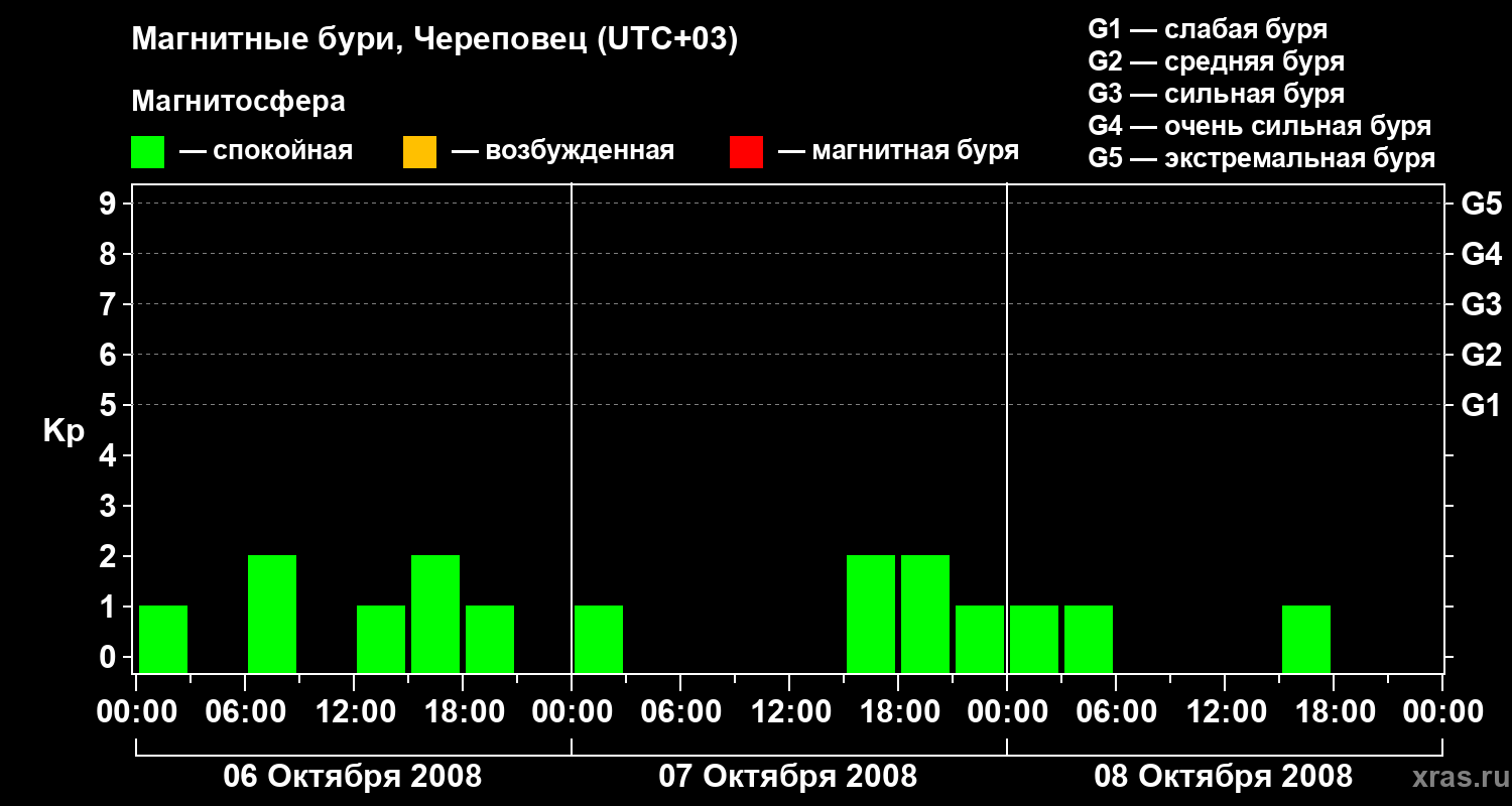 Изменения геомагнитного индекса Kp с 6 по 8 октября 2008 года для средних широт