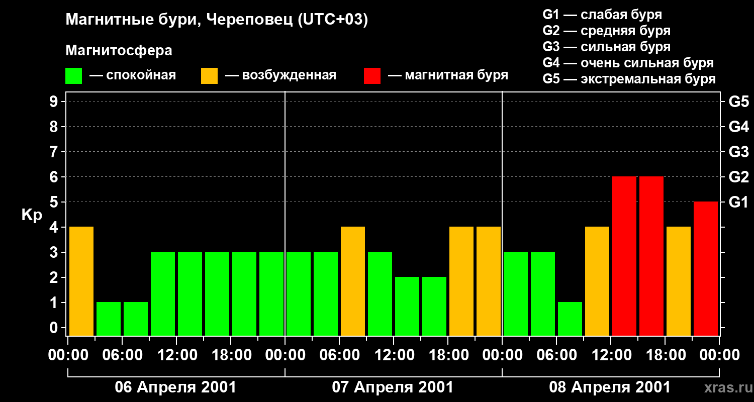 Изменения геомагнитного индекса Kp с 6 по 8 апреля 2001 года для средних широт