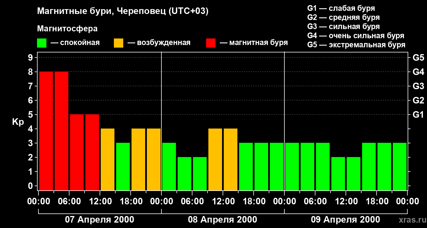 Изменения геомагнитного индекса Kp с 7 по 9 апреля 2000 года для средних широт