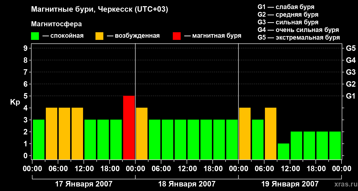 Изменения геомагнитного индекса Kp с 17 по 19 января 2007 года для средних широт