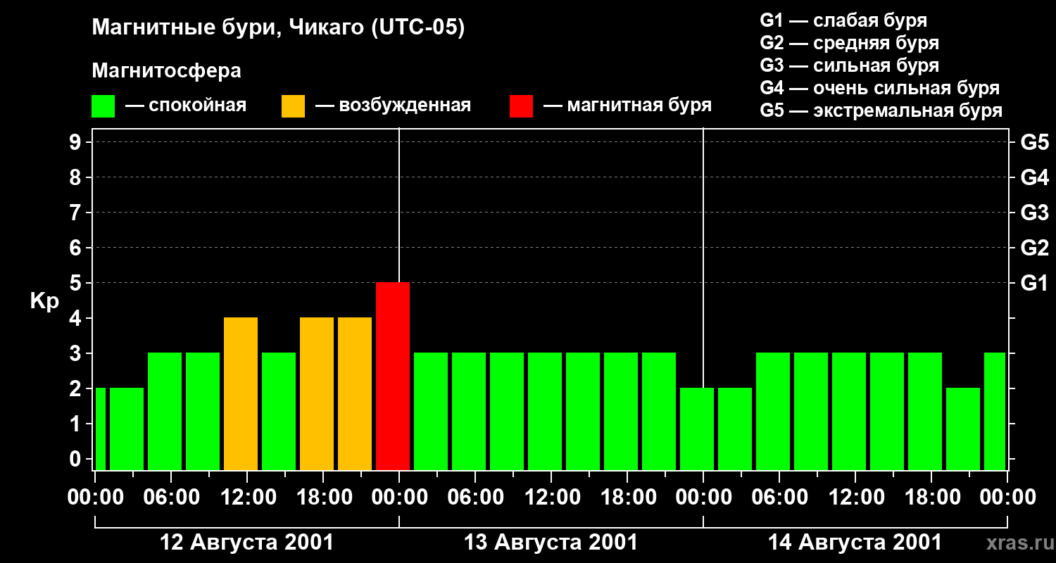 Изменения геомагнитного индекса Kp с 12 по 14 августа 2001 года для средних широт
