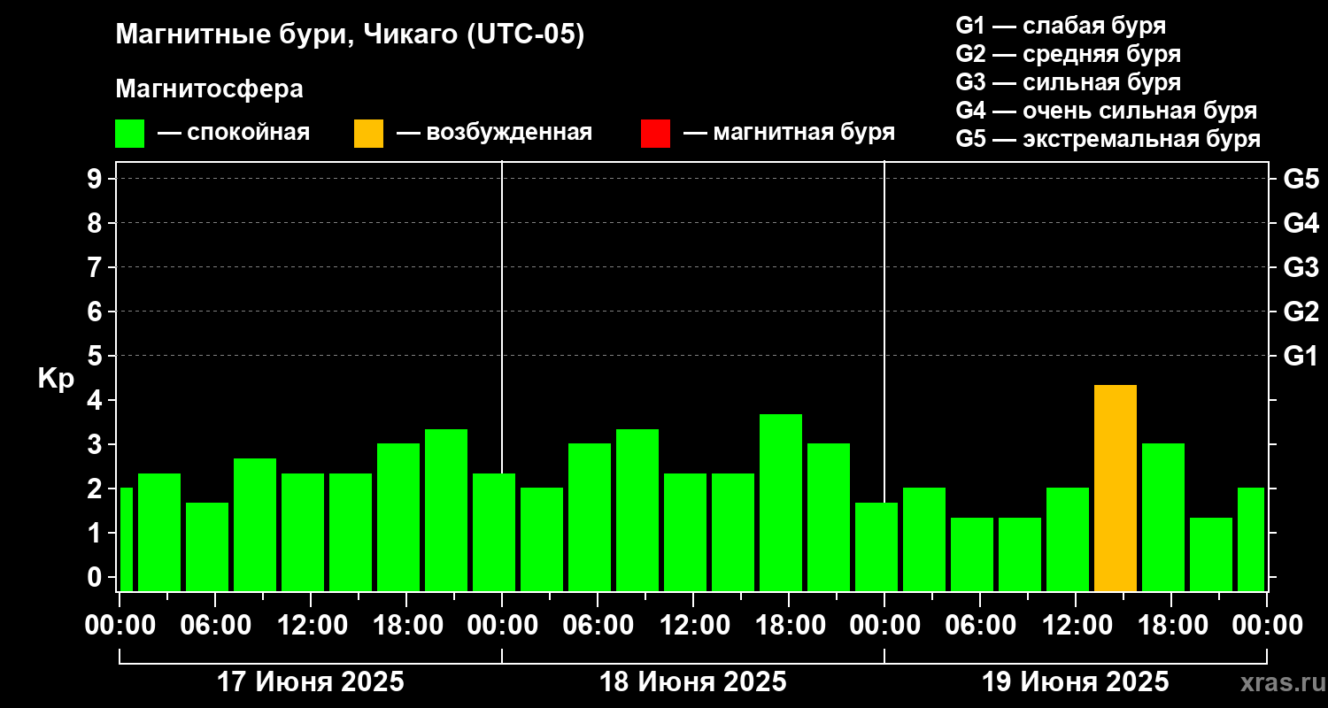 Изменения геомагнитного индекса Kp с 17 по 19 июня 2025 года для средних широт