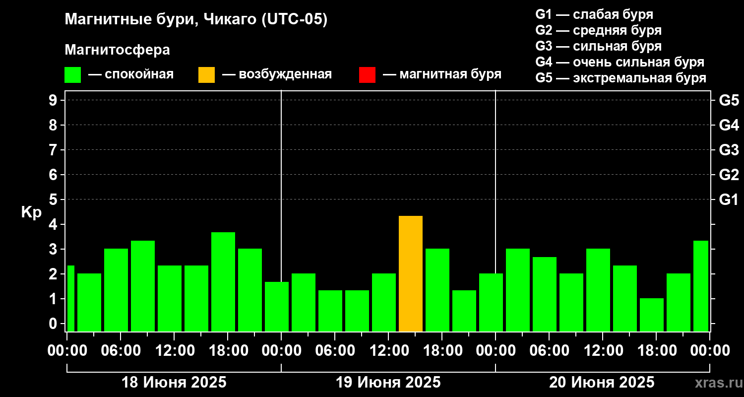 Изменения геомагнитного индекса Kp с 18 по 20 июня 2025 года для средних широт