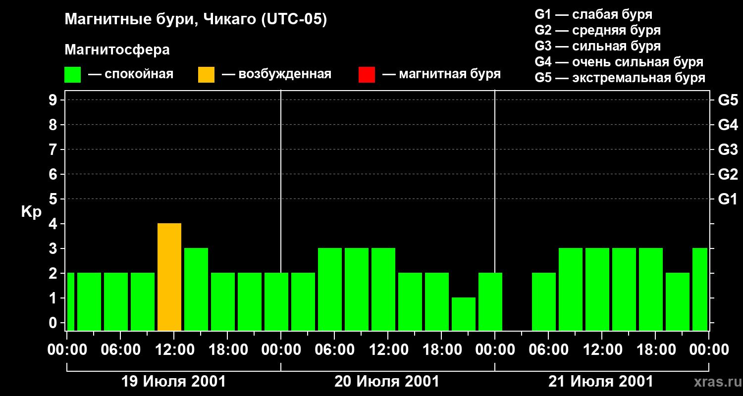 Изменения геомагнитного индекса Kp с 19 по 21 июля 2001 года для средних широт