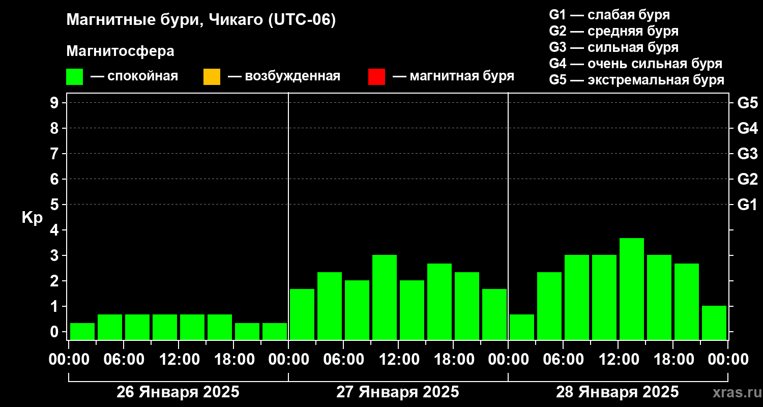 Изменения геомагнитного индекса Kp с 26 по 28 января 2025 года для средних широт