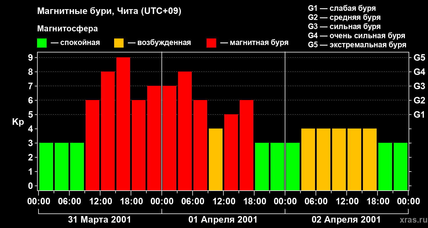 Изменения геомагнитного индекса Kp с 31 марта по 2 апреля 2001 года для средних широт