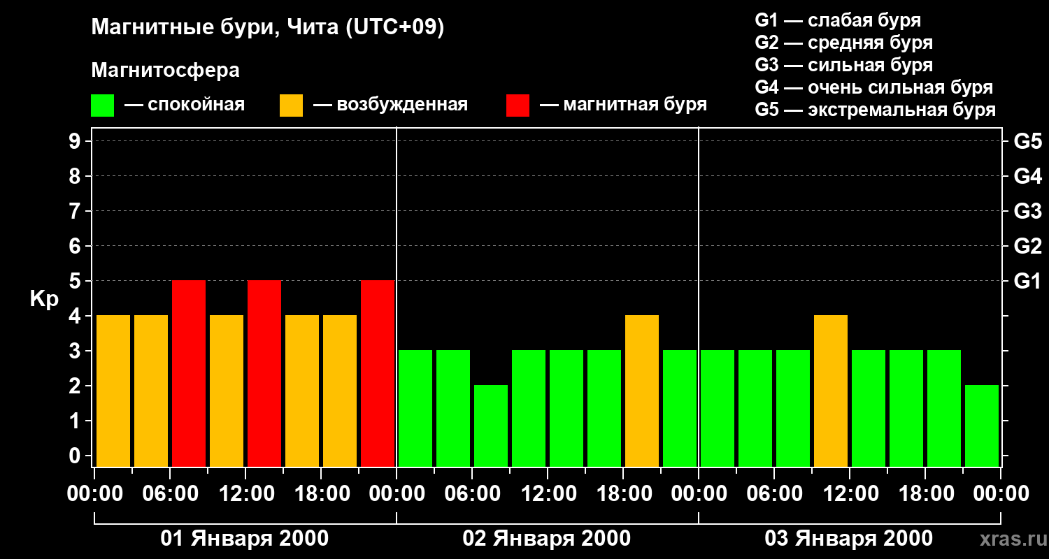 Изменения геомагнитного индекса Kp с 1 по 3 января 2000 года для средних широт