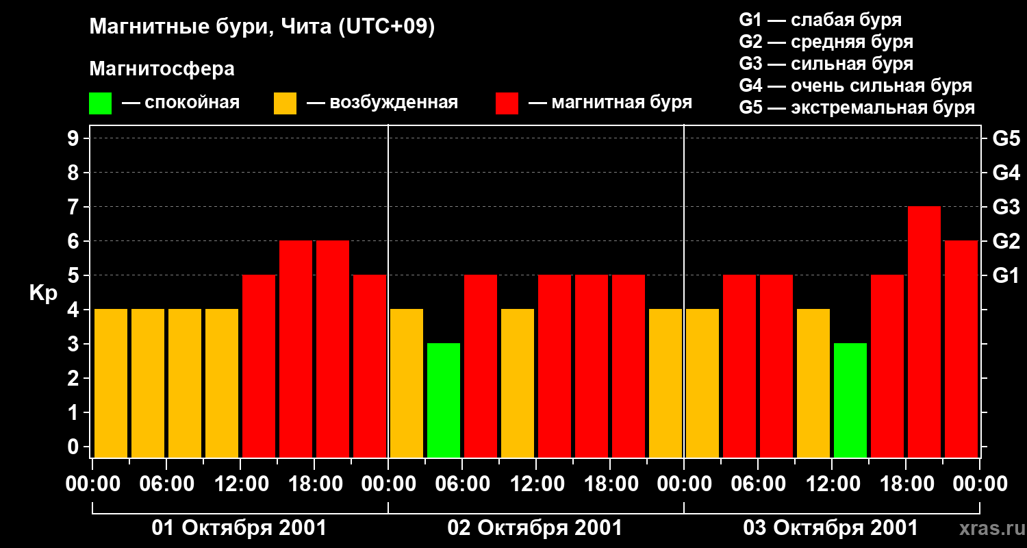 Изменения геомагнитного индекса Kp с 1 по 3 октября 2001 года для средних широт