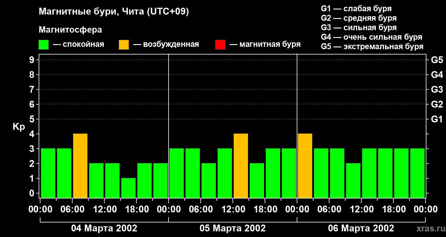 Изменения геомагнитного индекса Kp с 4 по 6 марта 2002 года для средних широт