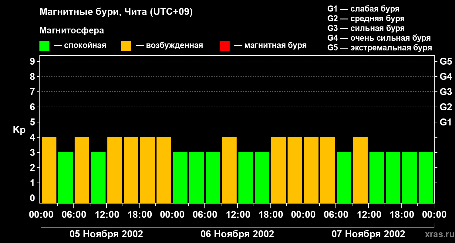 Изменения геомагнитного индекса Kp с 5 по 7 ноября 2002 года для средних широт