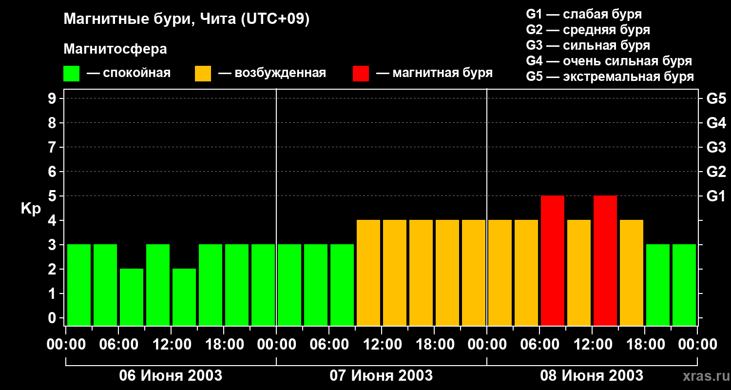Изменения геомагнитного индекса Kp с 6 по 8 июня 2003 года для средних широт