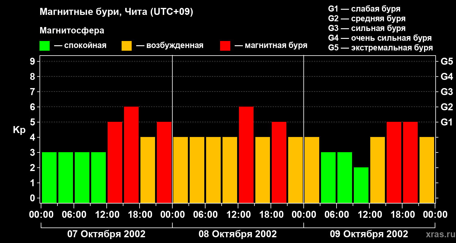 Изменения геомагнитного индекса Kp с 7 по 9 октября 2002 года для средних широт