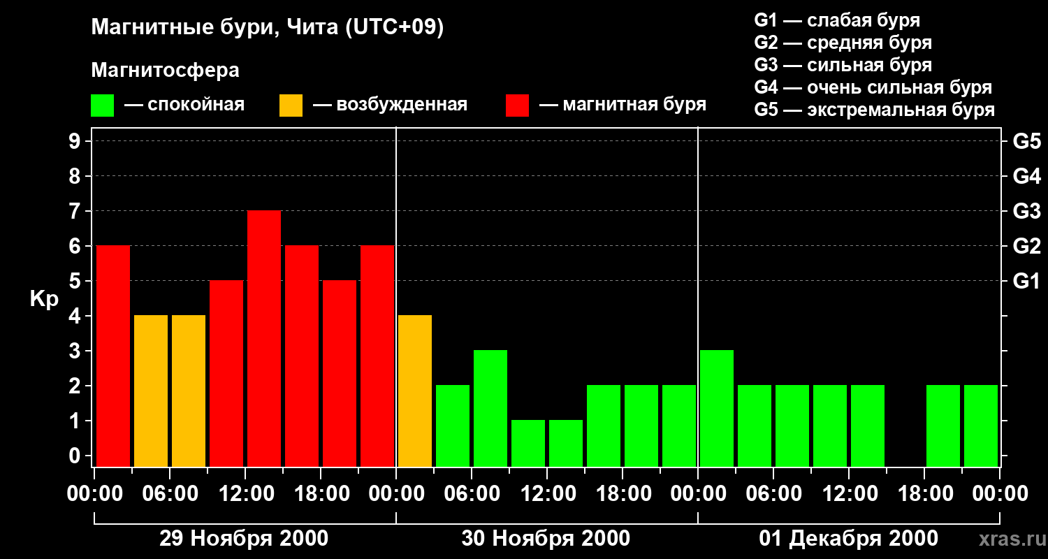 Изменения геомагнитного индекса Kp с 29 ноября по 1 декабря 2000 года для средних широт