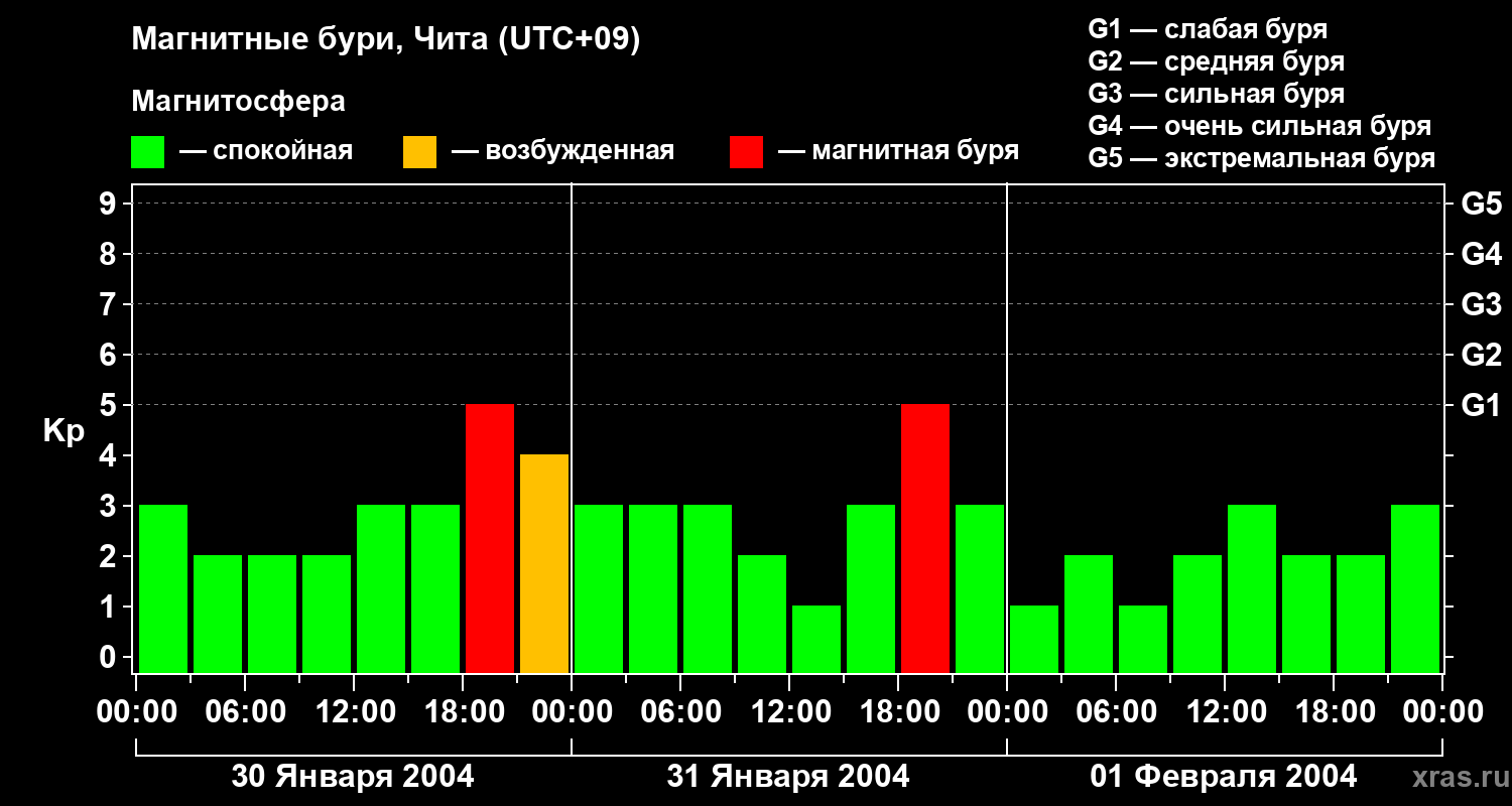 Изменения геомагнитного индекса Kp с 30 января по 1 февраля 2004 года для средних широт