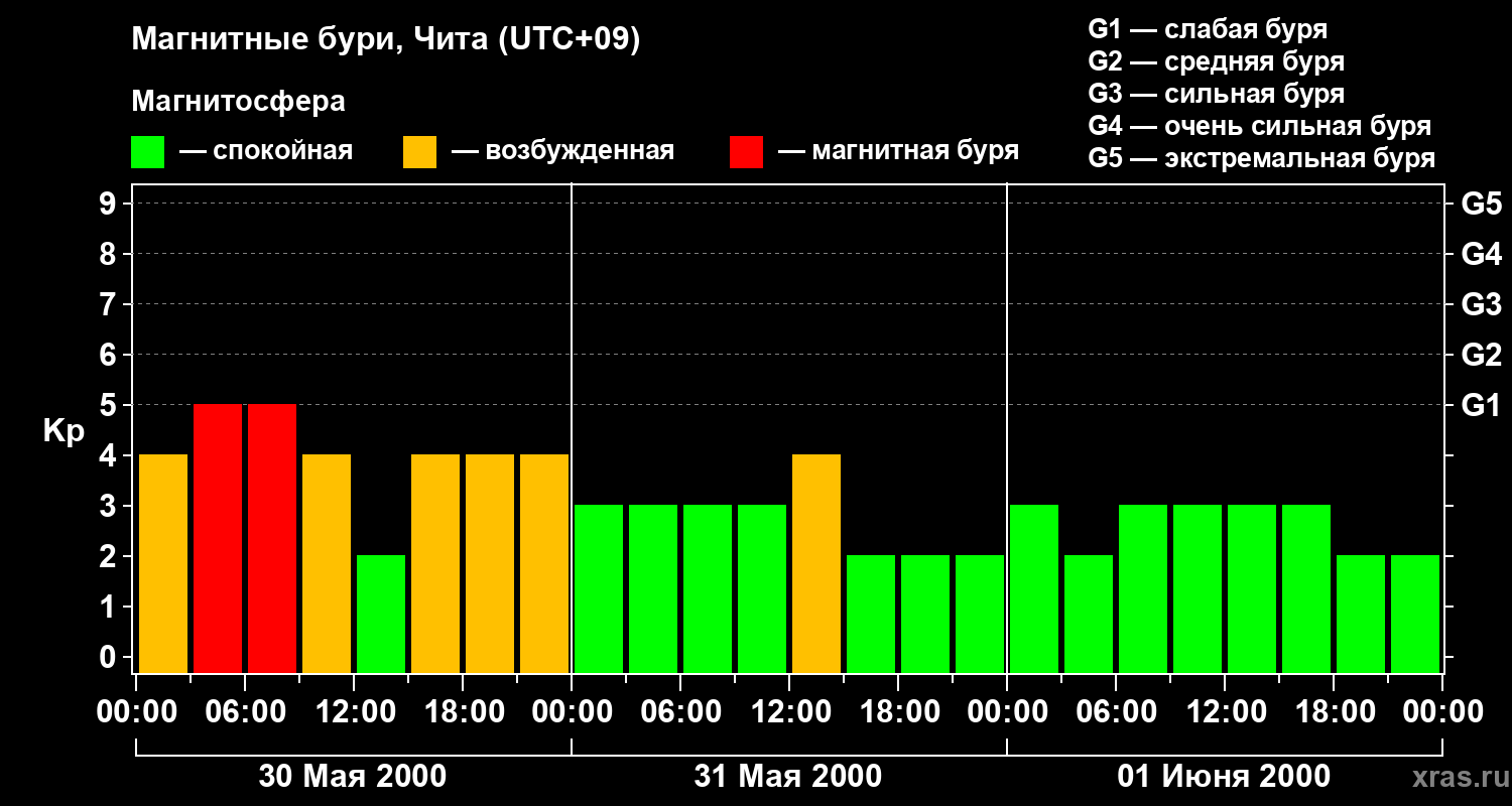 Изменения геомагнитного индекса Kp с 30 мая по 1 июня 2000 года для средних широт