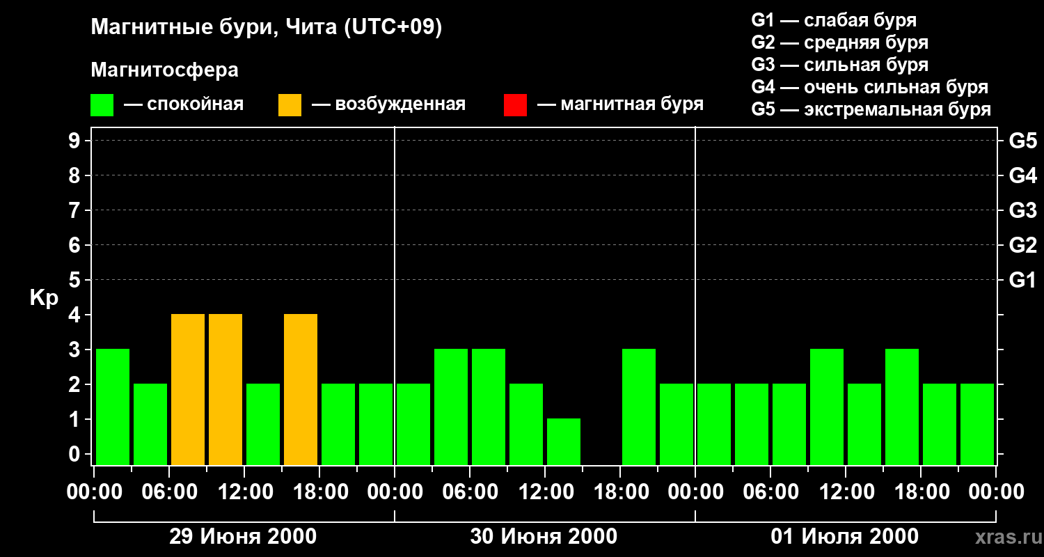 Изменения геомагнитного индекса Kp с 29 июня по 1 июля 2000 года для средних широт