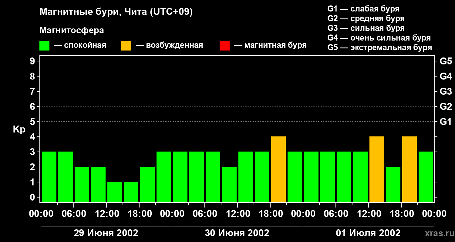 Изменения геомагнитного индекса Kp с 29 июня по 1 июля 2002 года для средних широт