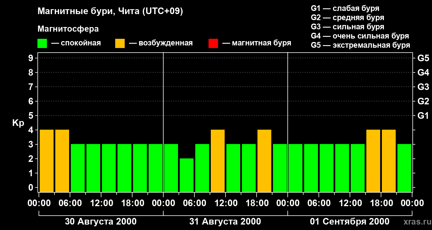 Изменения геомагнитного индекса Kp с 30 августа по 1 сентября 2000 года для средних широт