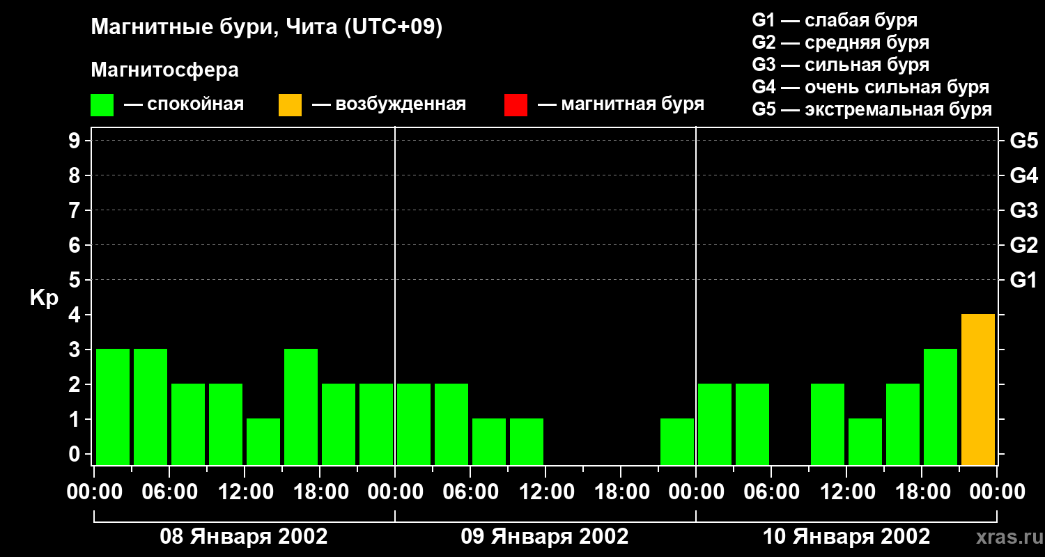 Изменения геомагнитного индекса Kp с 8 по 10 января 2002 года для средних широт