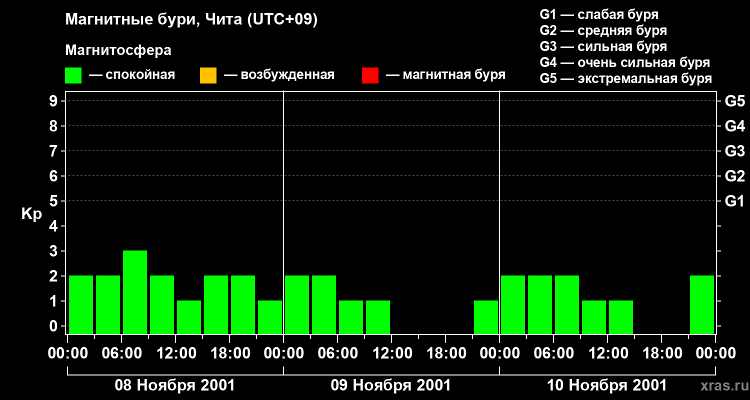 Изменения геомагнитного индекса Kp с 8 по 10 ноября 2001 года для средних широт