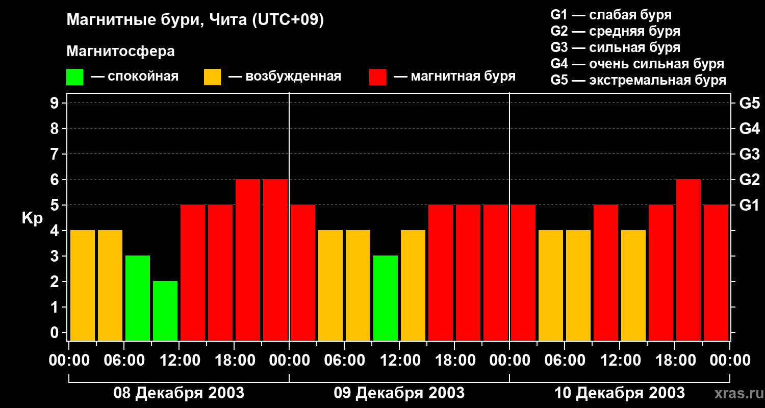Изменения геомагнитного индекса Kp с 8 по 10 декабря 2003 года для средних широт