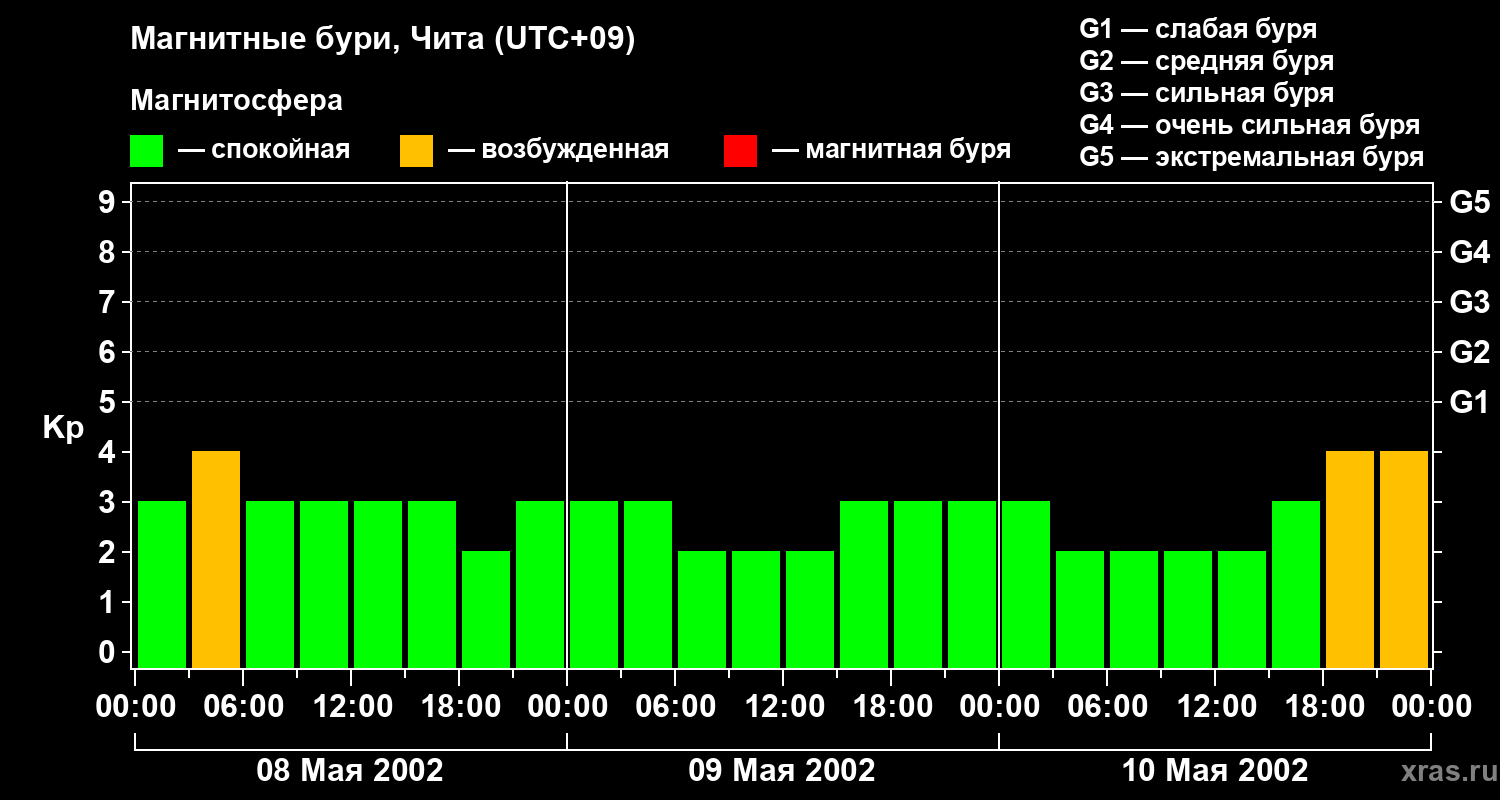Изменения геомагнитного индекса Kp с 8 по 10 мая 2002 года для средних широт