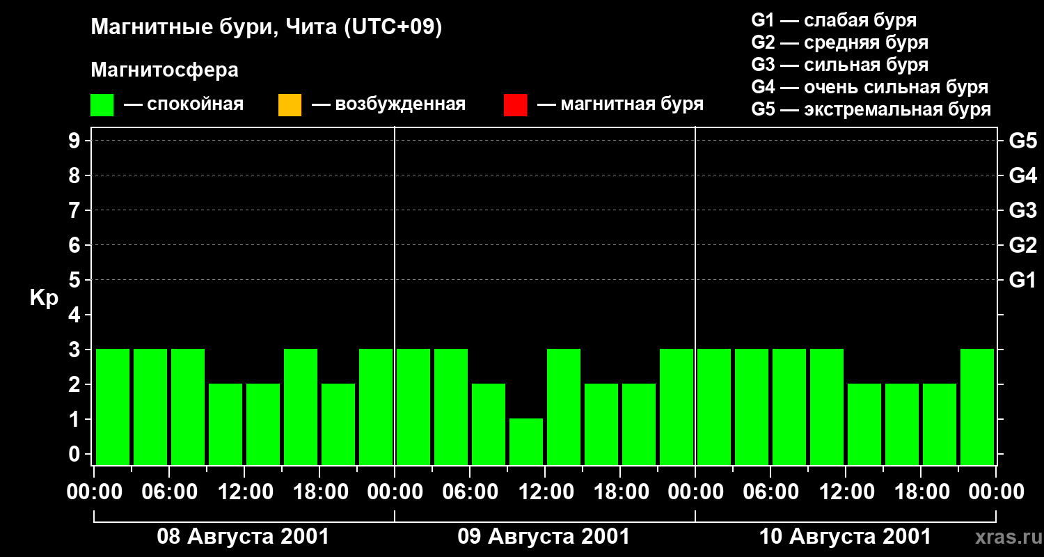 Изменения геомагнитного индекса Kp с 8 по 10 августа 2001 года для средних широт