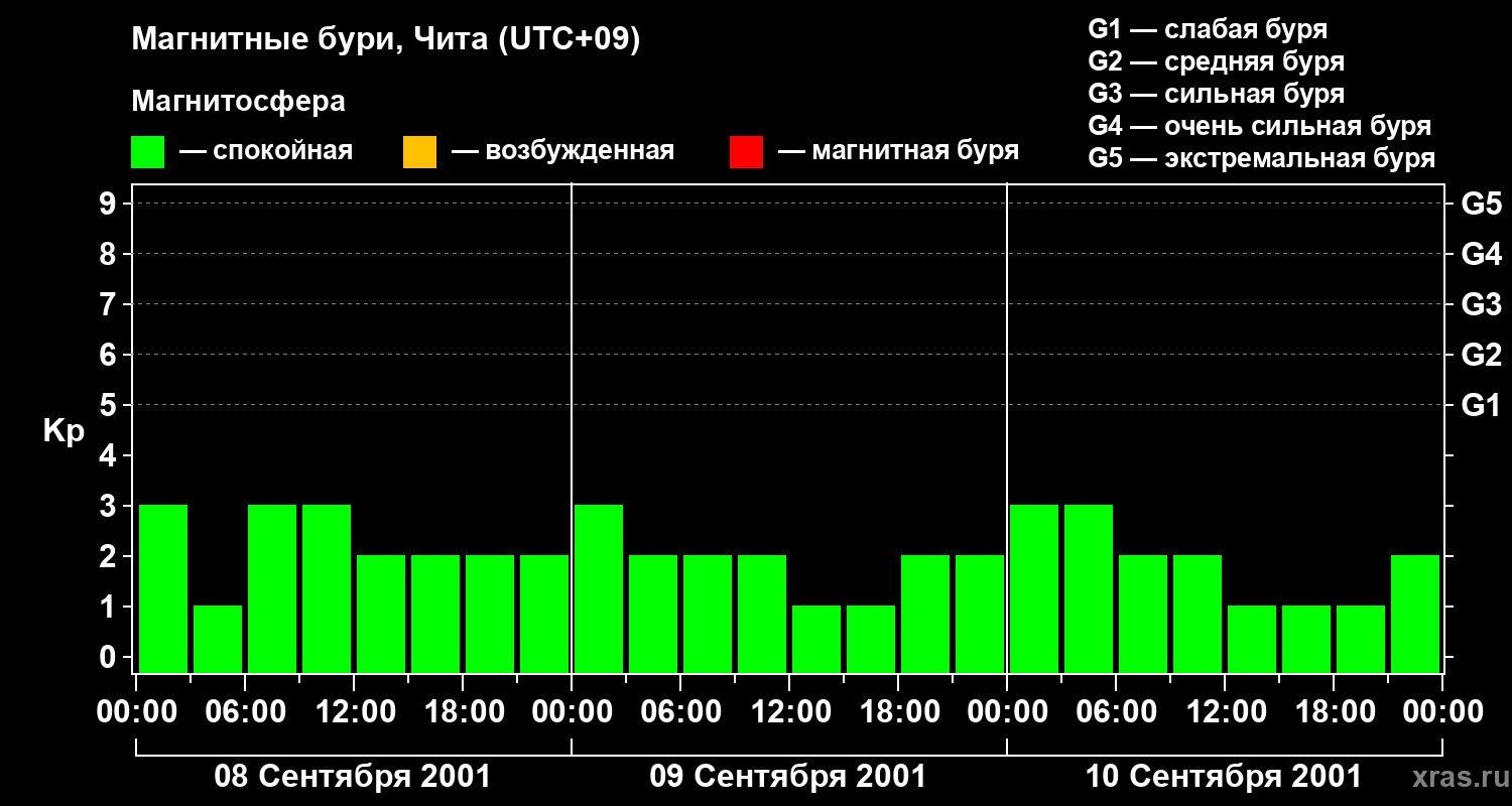Изменения геомагнитного индекса Kp с 8 по 10 сентября 2001 года для средних широт