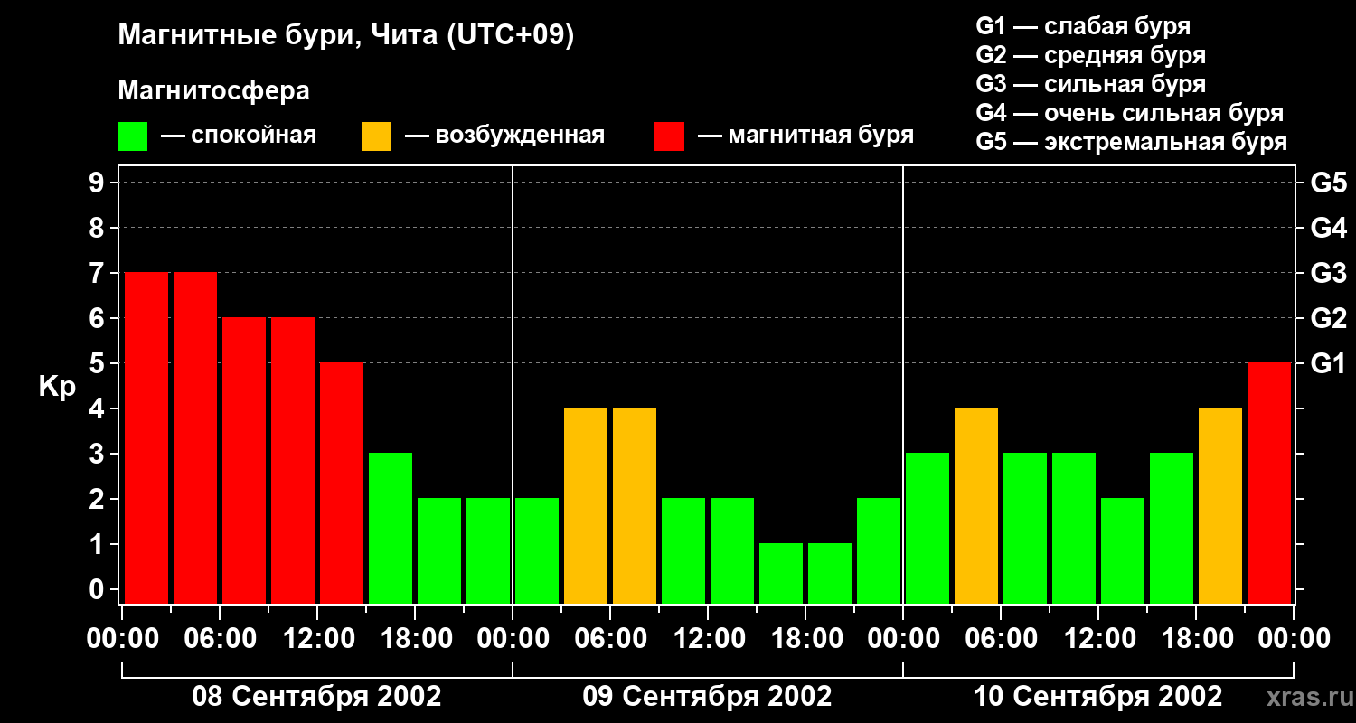 Изменения геомагнитного индекса Kp с 8 по 10 сентября 2002 года для средних широт