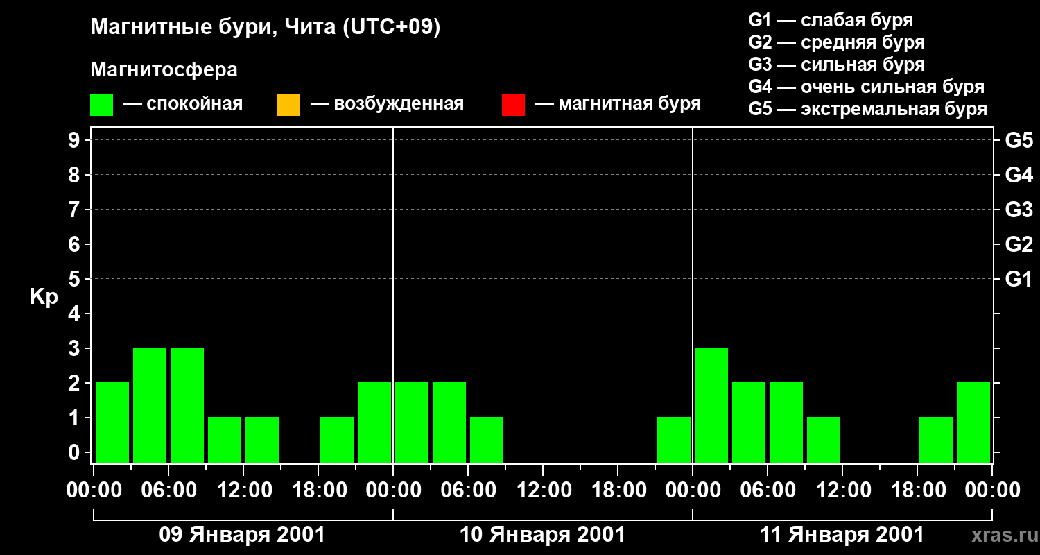 Изменения геомагнитного индекса Kp с 9 по 11 января 2001 года для средних широт