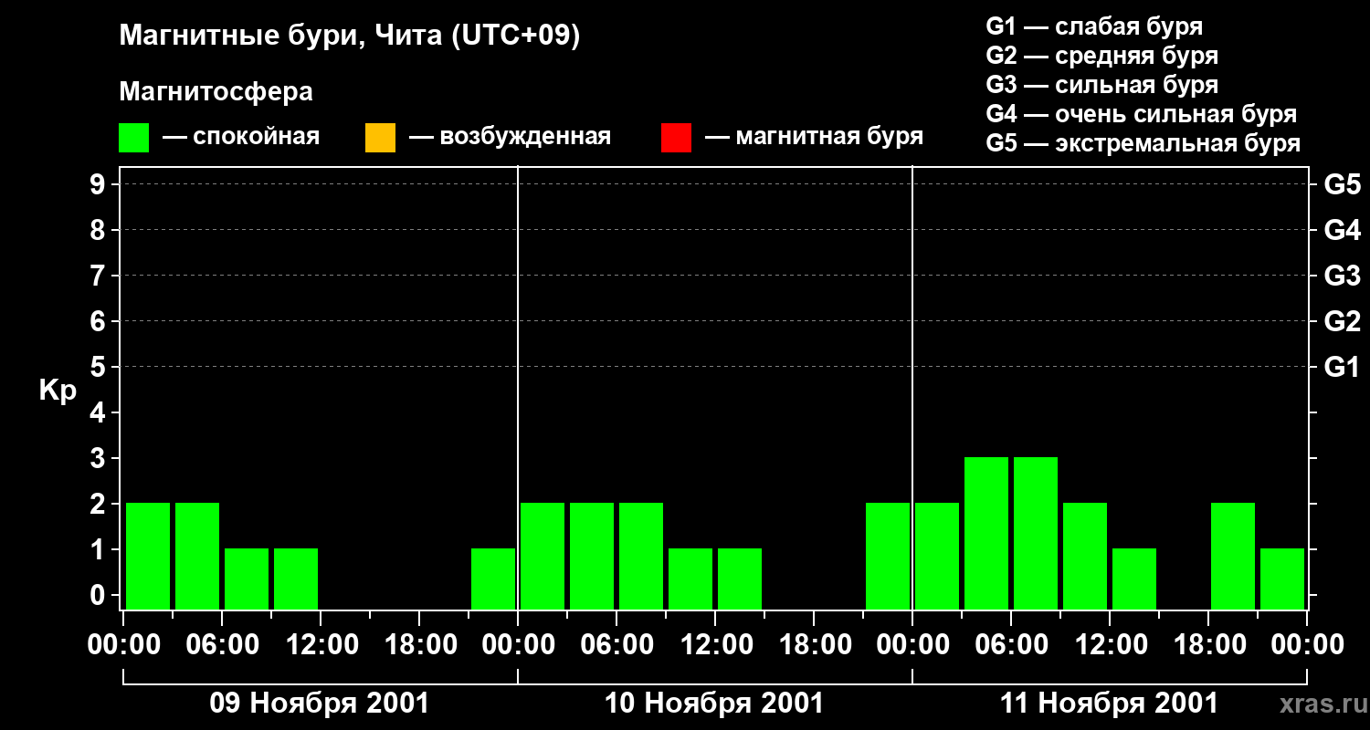 Изменения геомагнитного индекса Kp с 9 по 11 ноября 2001 года для средних широт