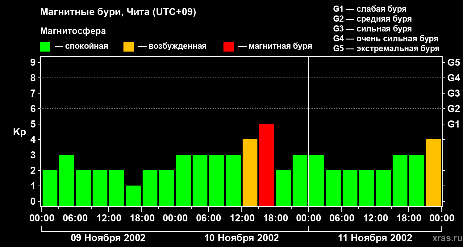 Изменения геомагнитного индекса Kp с 9 по 11 ноября 2002 года для средних широт