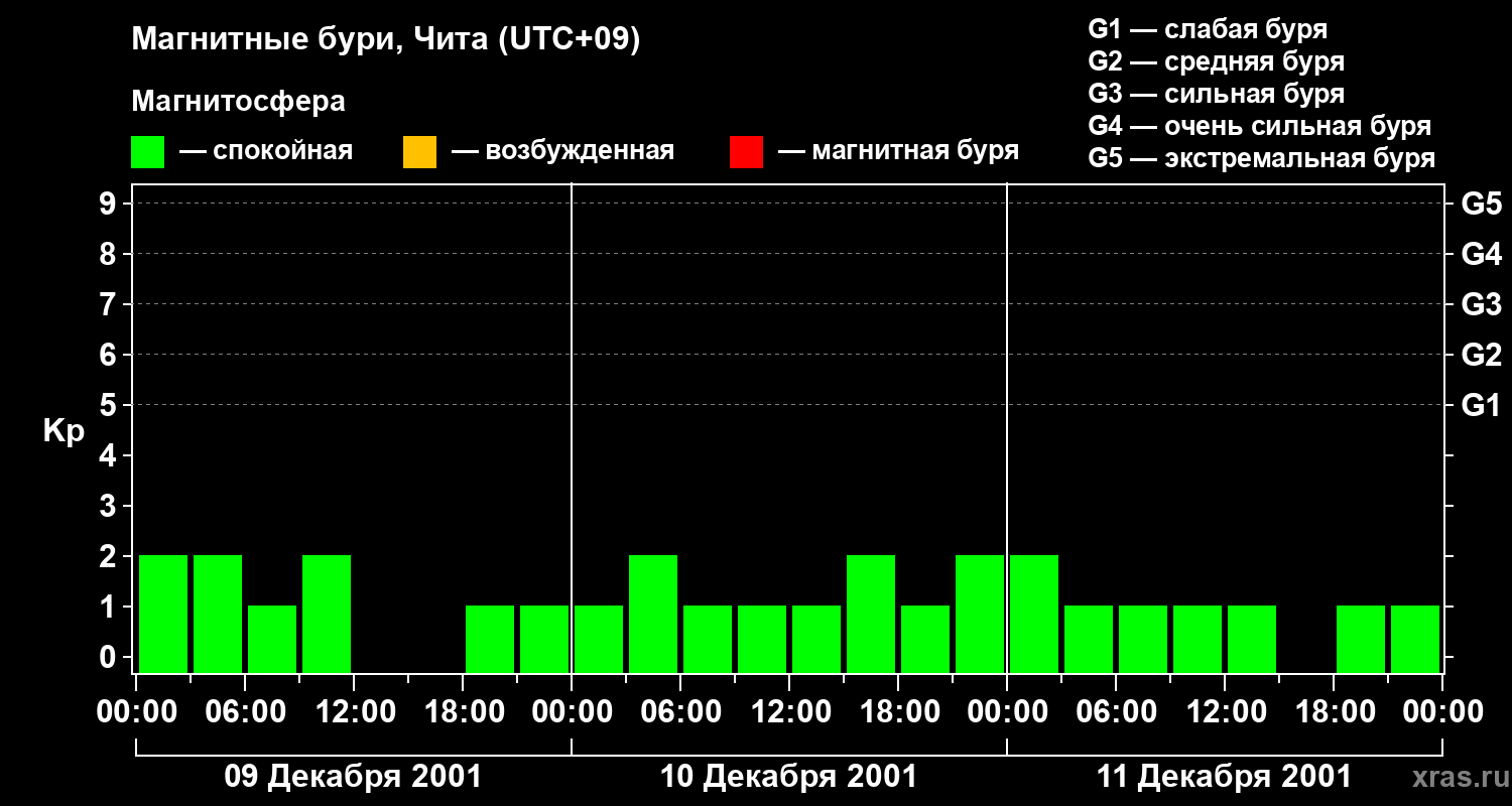 Изменения геомагнитного индекса Kp с 9 по 11 декабря 2001 года для средних широт