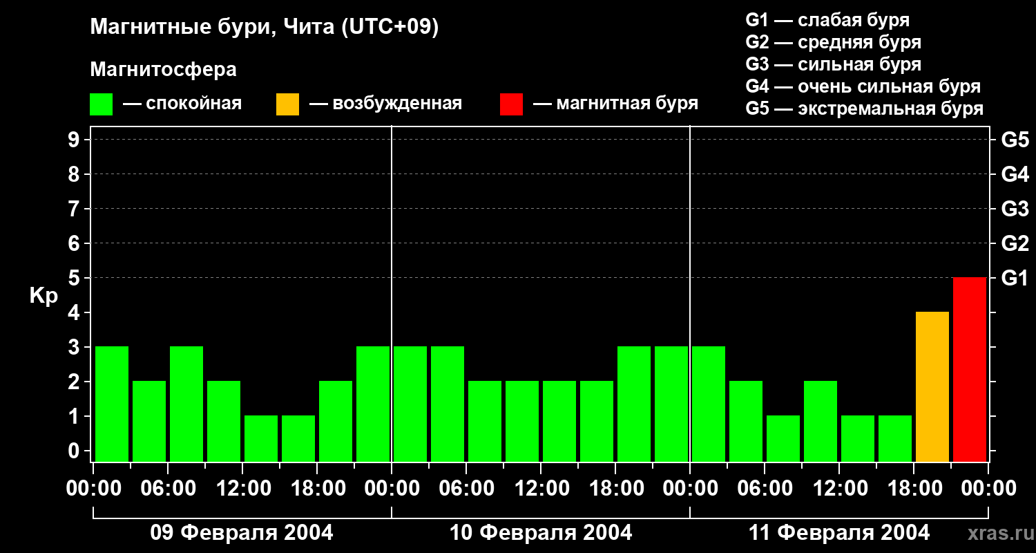 Изменения геомагнитного индекса Kp с 9 по 11 февраля 2004 года для средних широт