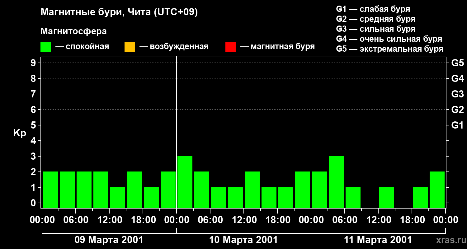 Изменения геомагнитного индекса Kp с 9 по 11 марта 2001 года для средних широт