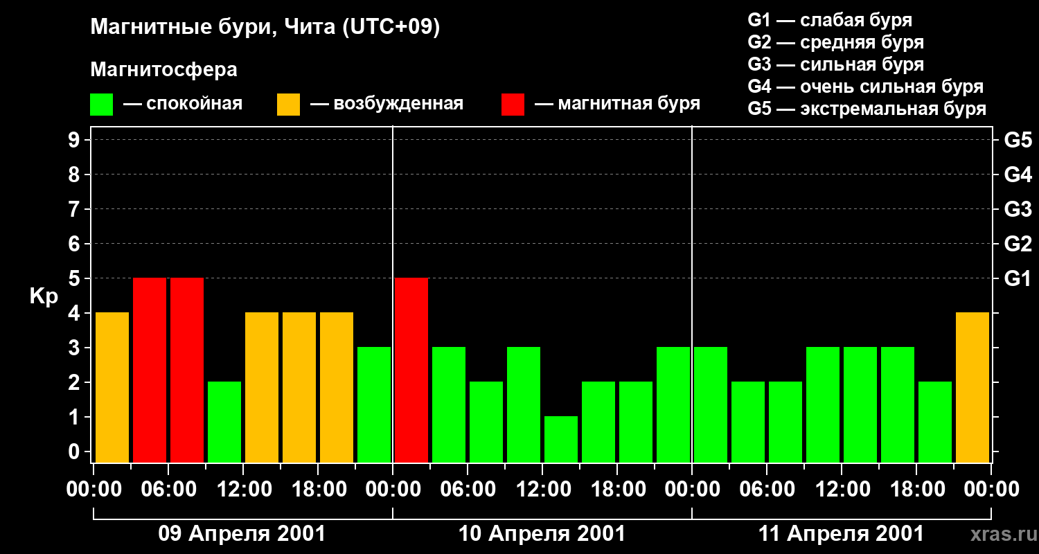 Изменения геомагнитного индекса Kp с 9 по 11 апреля 2001 года для средних широт