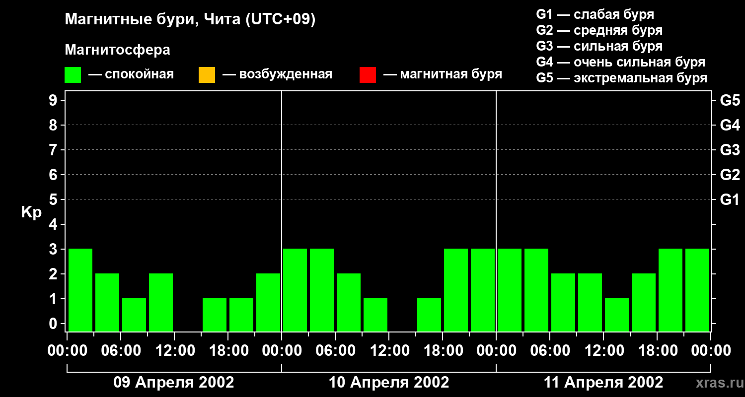 Изменения геомагнитного индекса Kp с 9 по 11 апреля 2002 года для средних широт