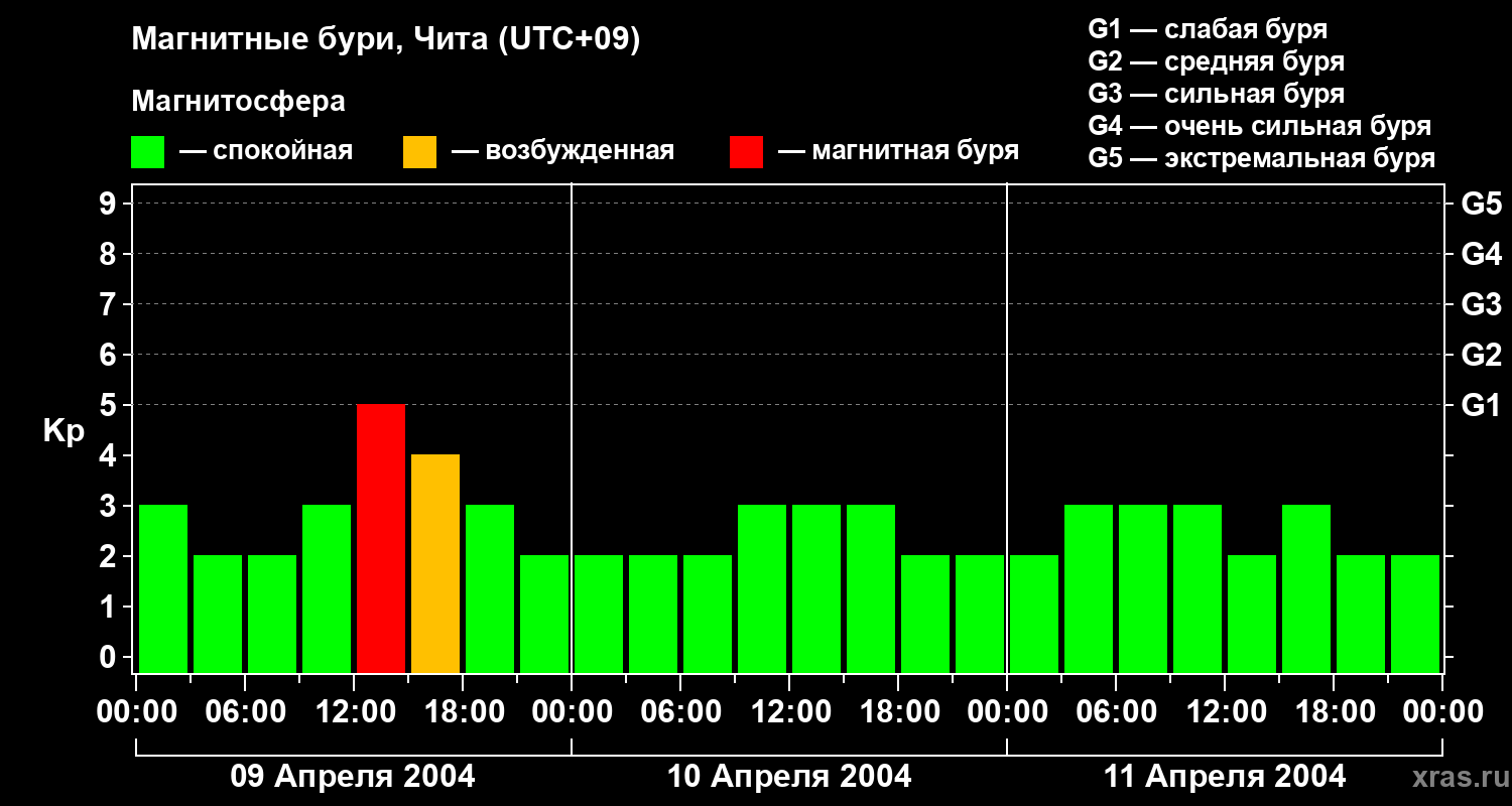 Изменения геомагнитного индекса Kp с 9 по 11 апреля 2004 года для средних широт
