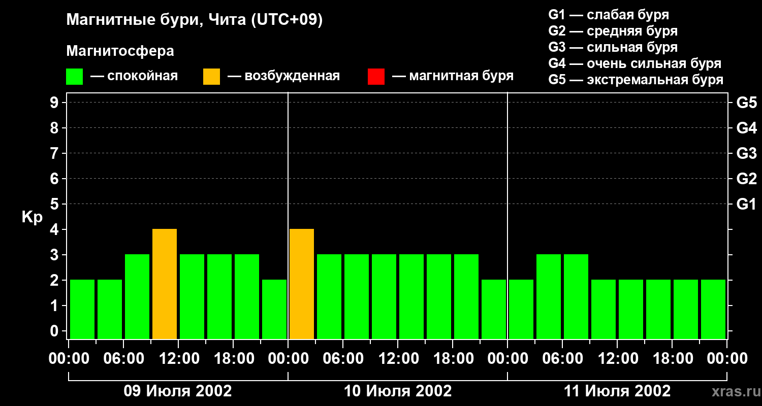 Изменения геомагнитного индекса Kp с 9 по 11 июля 2002 года для средних широт