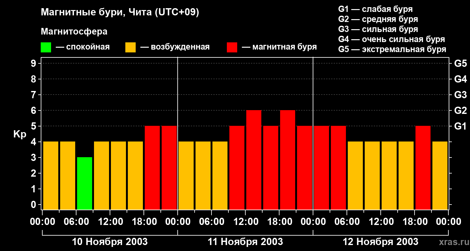 Изменения геомагнитного индекса Kp с 10 по 12 ноября 2003 года для средних широт