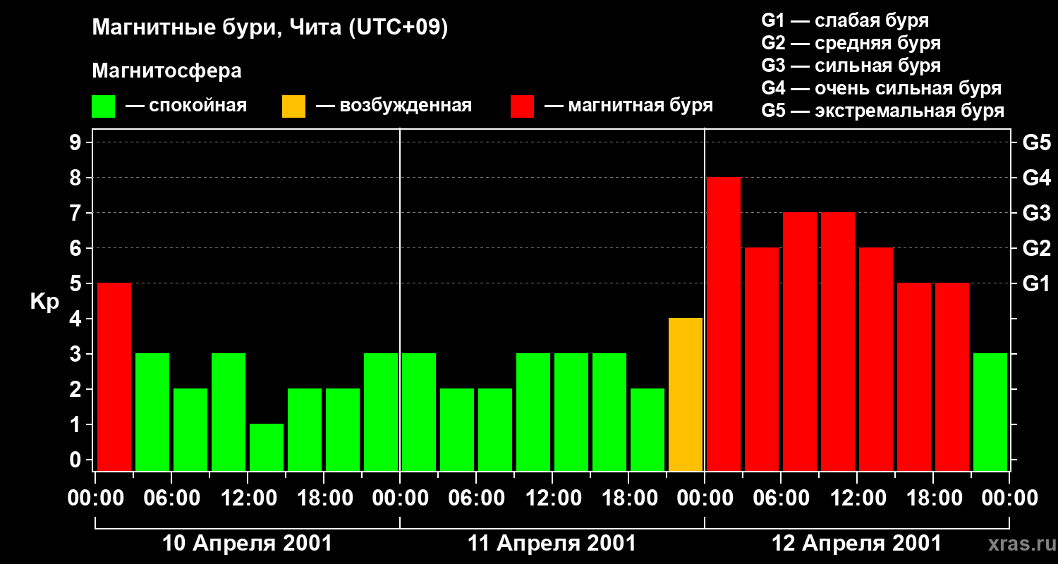 Изменения геомагнитного индекса Kp с 10 по 12 апреля 2001 года для средних широт