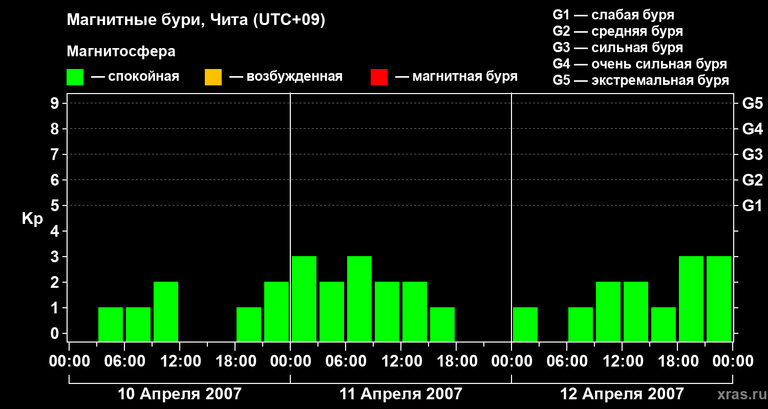 Изменения геомагнитного индекса Kp с 10 по 12 апреля 2007 года для средних широт